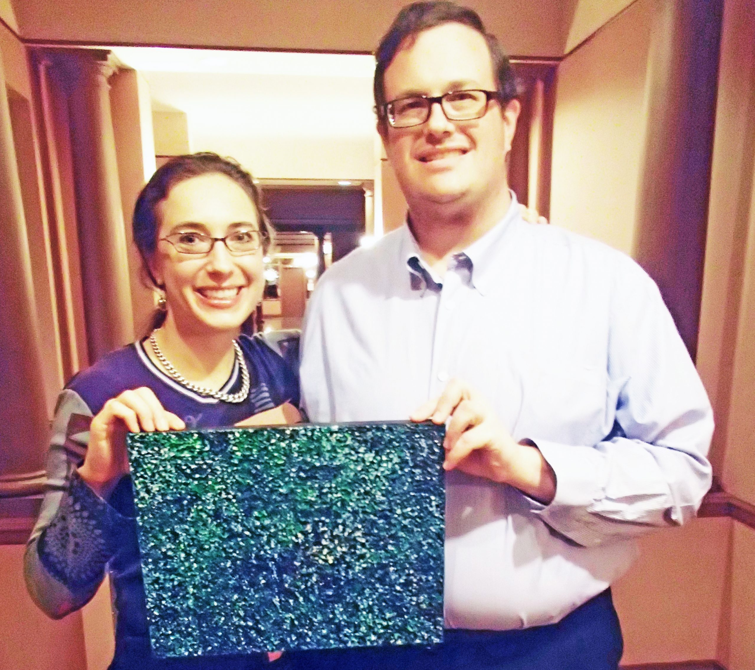 Kelli Stretesky with one of her collectors holding the piece “Speculation II”